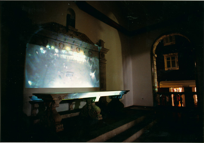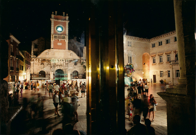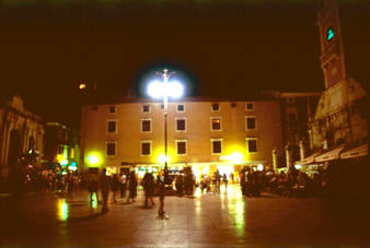 Wireless video transmission broadcasted real-time image of the city square at two vis-à-vis locations at the square. Wide angle image was captured with camera positioned at the top of lamp at the meddle of square. Sites with projections was Gradska loza [renaissance city court, today art gallery] and Gradska straza [baroque city watch, today Ethnographic museum]. The city watch not working for already ten years because of reconstruction, so it was possible to install back projection at the clock's transparent background.