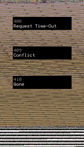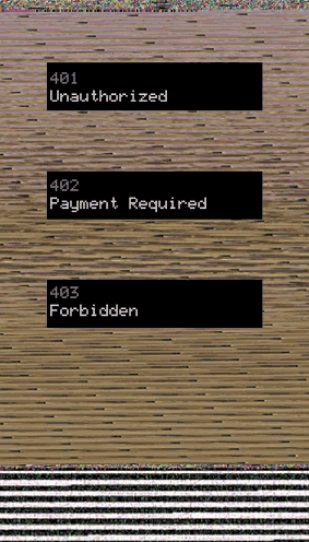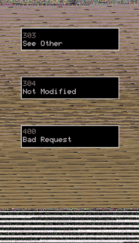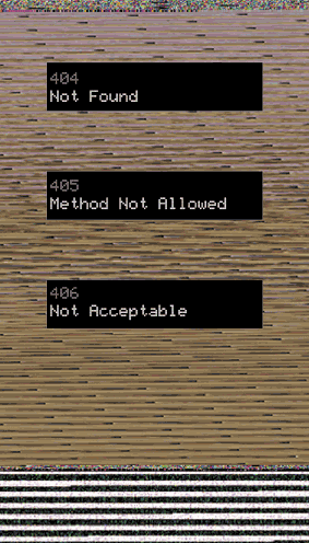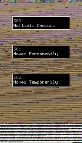 'Redirection + Client Error ' series consists of five works, each read three Web Server Result (HTML Error) Codes, more preciesly from status messages that might be returned: 3xx: Redirection and 4xx: Client Error. Background image is a video signal error. |