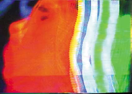 | 'Crypted TV porn [analogue] stills' series consists of digital prints of the TV-stills taken from crypted [coded] TV signal. TV broadcasters crypting the video signal for one which don't pay subscription fee. Nevertheless such a signals are present in both the air and at the Amsterdam TV cable. In particular, TV programme with hard-core porno films was recorded. Within unregular rhythms of distorted and noisy moving images of unsynchronised video signal the image processing just happened by itself: polarisation, black and white and colour negative inversions, image moving out of frame horizontal and vertical, strobo- effect etc. |