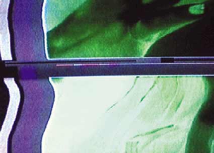 | 'Crypted TV porn [analogue] stills' series consists of digital prints of the TV-stills taken from crypted [coded] TV signal. TV broadcasters crypting the video signal for one which don't pay subscription fee. Nevertheless such a signals are present in both the air and at the Amsterdam TV cable. In particular, TV programme with hard-core porno films was recorded. Within unregular rhythms of distorted and noisy moving images of unsynchronised video signal the image processing just happened by itself: polarisation, black and white and colour negative inversions, image moving out of frame horizontal and vertical, strobo- effect etc. |