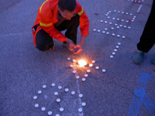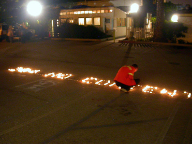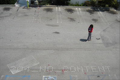 The site specific installation consists of a typographic image which reads 204_NO_CONTENT, comprised of 193 burning candles set-up in an empty parking lot. The event's performance is dependent on the wind: if there is no wind, the author will burn the candles and leave the site. As the event is part of a group exhibition, some people will be wandering around the installation site. The ambient / outdoor light will naturally fade-out, and the candles will burn out within 3 hours as another analog fade-out. If windy, the author will attempt to light the candles for 1 hour. If raining, there will be no burning candles. In case of an earthquake, the typographic image will be distorted.