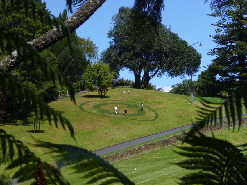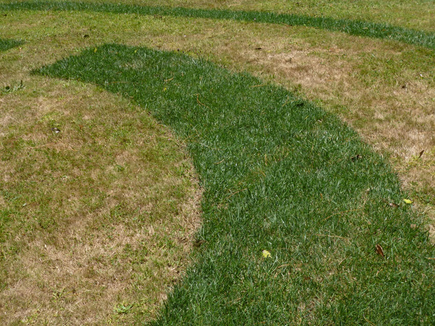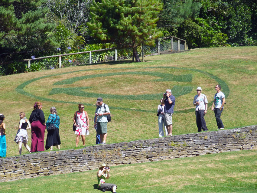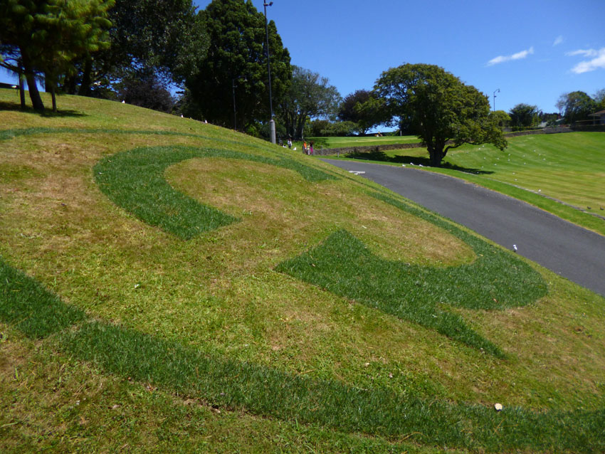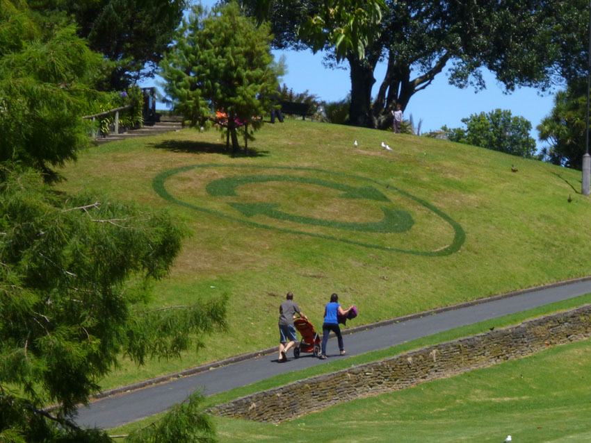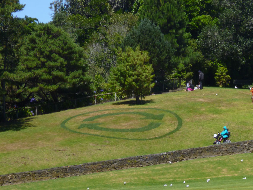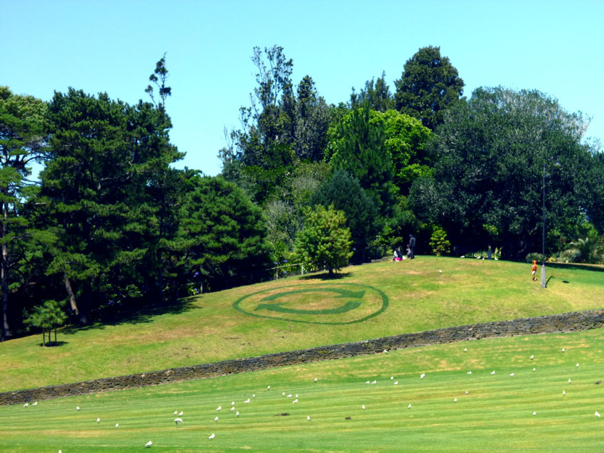 The reload_refresh_sync icon is planted into the side of the Bowl of Brooklands at the Pukekura Park in New Plymouth. When clicked by a computer mouse, the ‘reload’ or ‘refresh’ button reloads a page when browsing the internet. The same icon is used to sync electronic equipment, and also as a symbol for recycling. The installation act as a small button at the Earth’s land surface, interacting with the entire planet from its location at New Zealand (39°11’5’’ S, 174°7’33’’ E). The artist is asking us to refresh our relationship to the environment, in a project that mixes humble turf with modern electronics. Image is aligned with Southward equinox. The Southward equinox (or September equinox) is the moment when the sun appears to cross the celestial equator, heading southward. Due to differences between the calendar year and the tropical year, the Southward equinox can occur at any time from the 22nd to the 24th day of September. In the Northern Hemisphere the Southward equinox is known as the autumnal equinox. In the Southern Hemisphere it is known as the vernal or spring equinox. The horticulture unit is made at existing grass field: majority of kikuya (Pennisetum clandestinum) mixed with clover (Trifolium) and Sport Rye / Perennial ryegrass (Lolium perenne). The newly planted ryegrass in the shape of “Reload” icon distinguish the design with different texture and darker shade of green colour. It is a mixture of Chewing fescue (Festuca rubra subsp. commutata), Sport Rye / Perennial ryegrass (Lolium perenne), and tall fescue (Festuca arundinacea). The maintenance of the horticulture unit “reload_refresh_sync” fits within regular maintenance of the grass fields in Kete Pukekura Park. It is expected that over the years the design will gradually vanish because of the mixing of new grass by surrounding grass, propelled by wind. It is open to made a new installation again. Project is made during SCANZ 2013: 3rd nature residency and supported by the Ministry of Culture of the Republic of Croatia. |